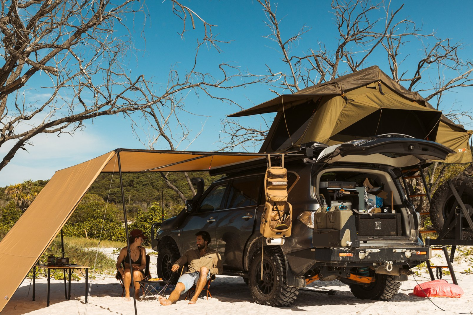 Our camp kitchen organiser conveniently hangs on a roof rack, for easy access to pockets, large storage space and and all tools at the tip of your fingers - saving precious space in your camp setup.