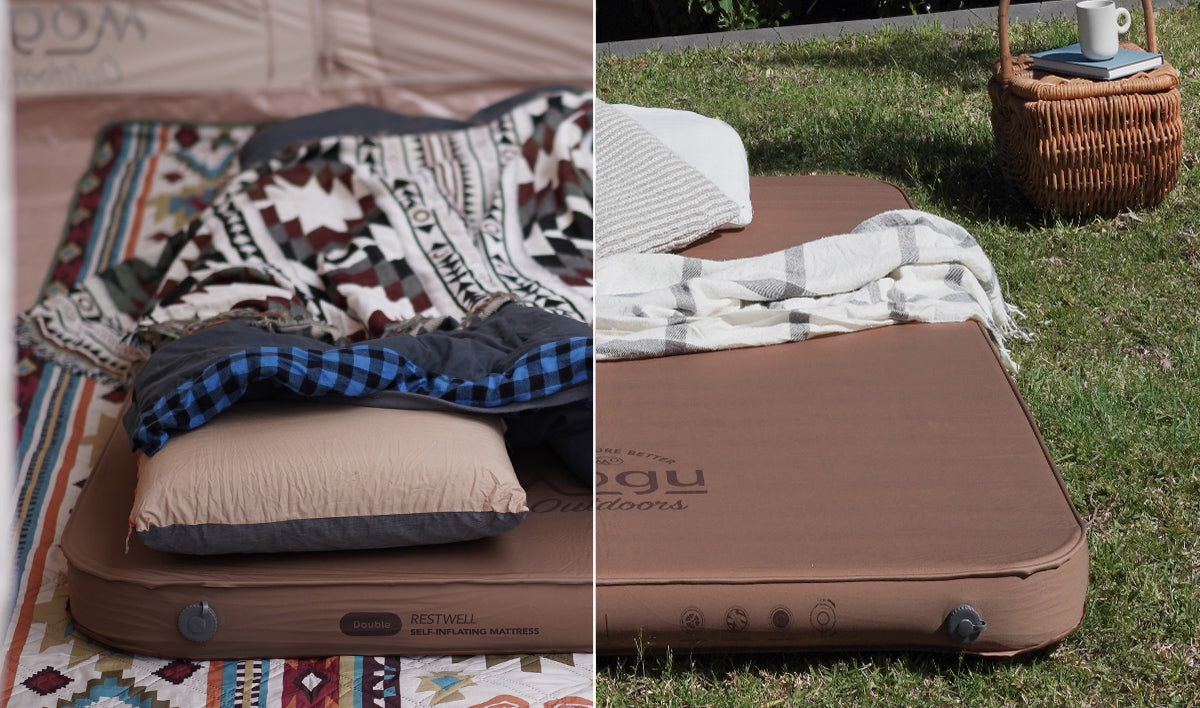 Dual valves make setup a breeze. Unroll, twist open, and let it inflate. For extra firmness, the outer bag doubles as a manual pump.
